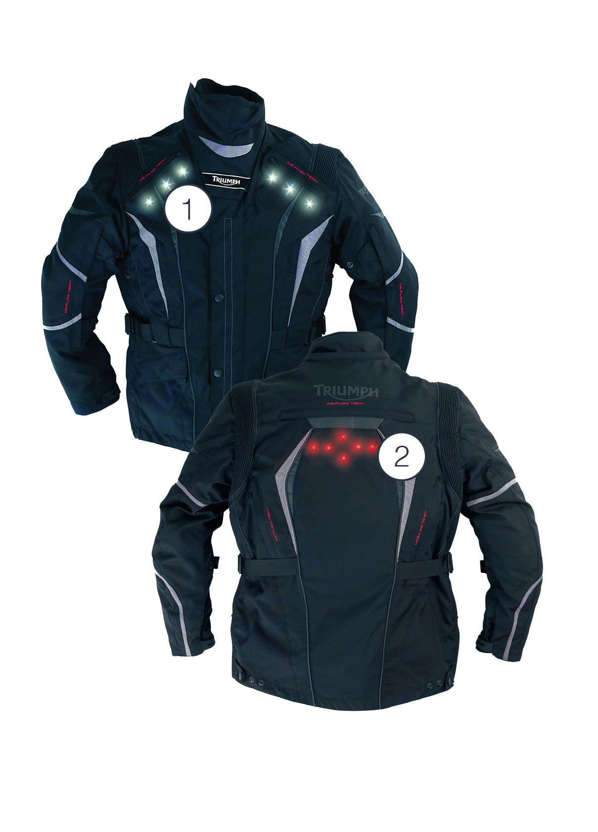 Our goal is to improve safety while keeping user comfort at a maximum. Light output can increase operational safety in dangerous as well as extreme situations. In traffic scenarios, white light increases visibility (1) and red light (2) indicates danger or the necessity to react. Triumph Motorcycle Ltd. introduced the Light Jacket powered with our LED system iLight L20 in the market, followed by other companies.